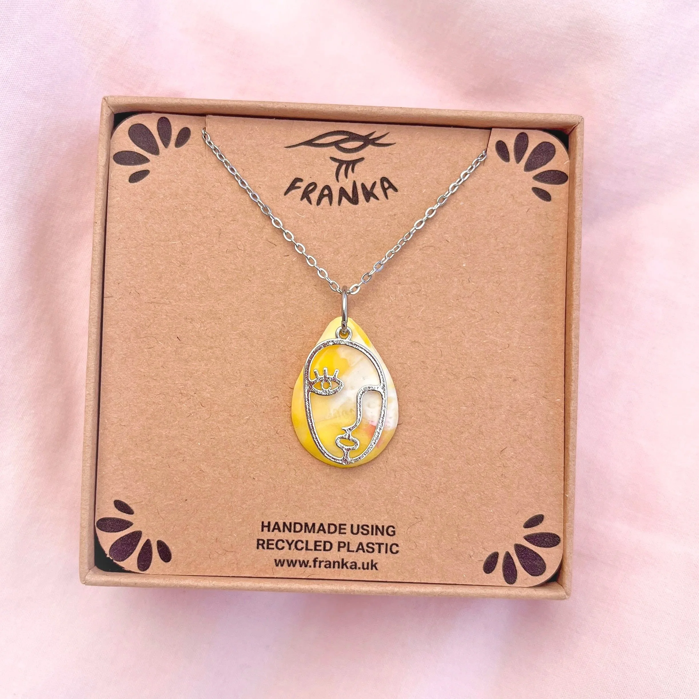 We use post-consumer plastic bottle tops to make this necklace. They’re melted down, pressed out and then carved by hand, that’s what makes every piece unique. Each necklace you buy is saving single use plastic, in one form or another, from being discarded into the ocean and/or the environment.