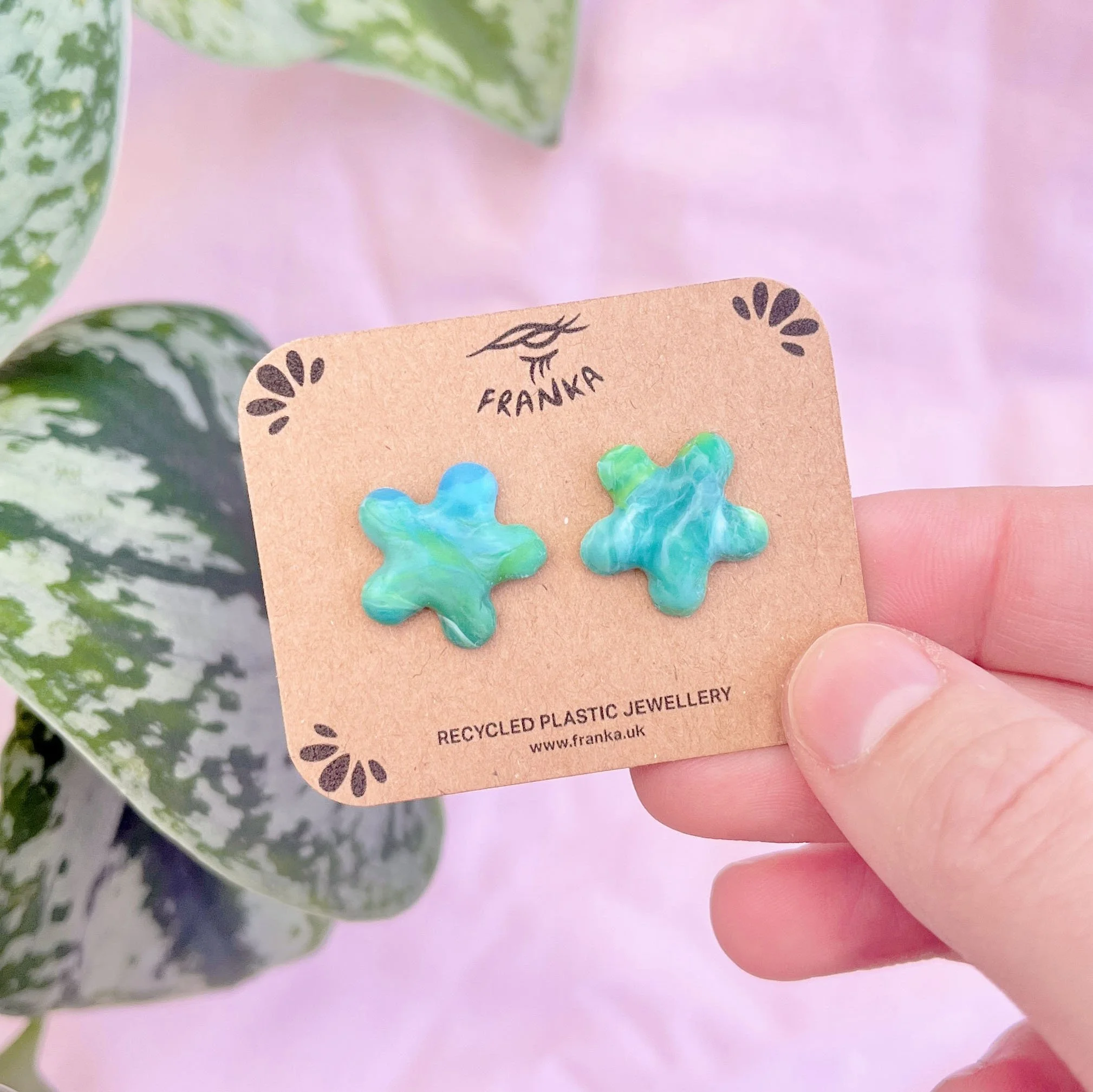 Old bottle tops are used to make these earrings, they’re melted down, pressed out and then carved by hand, that’s what makes every pair unique. Each pair of earrings you buy is saving single use plastic, in one form or another, from being discarded into oceans and/or the environment.